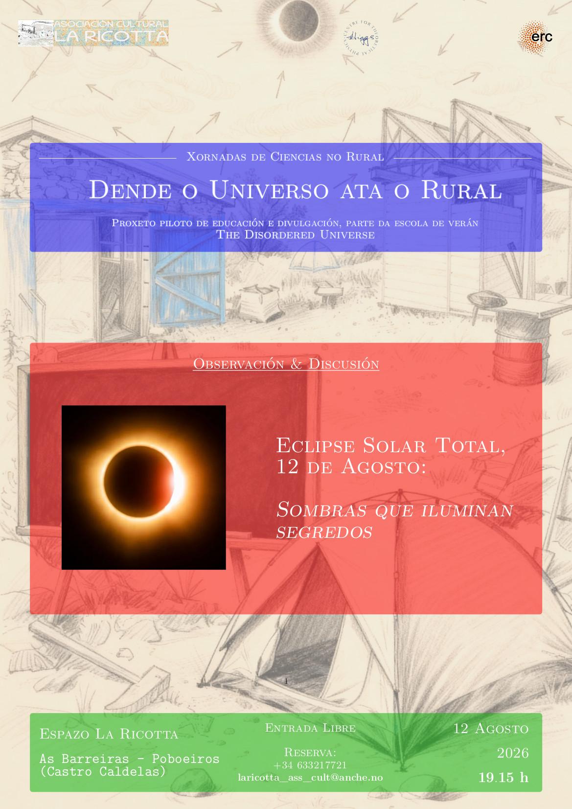 12/08/2026: Jornadas de Ciencias en el Rural – Desde el universo hasta el rural: Eclipse Solar Total, 12 Agosto: Sombras que iluminan secretos, 19.15h, Espazo La Ricotta, As Barreiras (Castro Caldelas, Ourense)